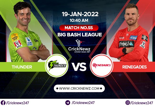 Sydney Thunder will face the Melbourne Renegades side in the 55th Match of the Australian T20 Bash. The Thunder outfit is placed at the third spot in the table, having mustered 8 wins in 13 matches.