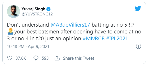 Yuvraj took to Twitter and wrote, “Don’t understand @ABdeVilliers17 batting at no 5 !!? our best batsmen after opening have to come at no 3 or no 4 in t20 just an opinion.”