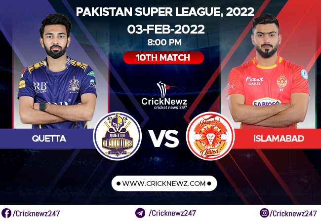 Quetta Gladiators will take on Islamabad United in the 10th match of the PSL 2022 on Thursday. Quetta Gladiators lost to Multan Sultans in a close contest by 6 runs and encountered their 2nd loss in this tournament.