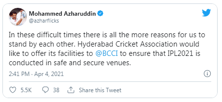 In the reports, it has been confirmed that Hyderabad has been chosen as the standup venue for hosting the IPL 2021 if cases in Mumbai continue to surge. Yesterday, the president of the Hyderabad Cricket Association Mohammed Azharuddin also tweeted to offer the venue to host the tournament.