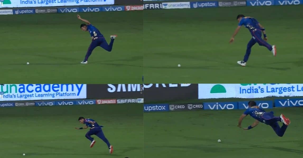 However, as he came close to the ball, he lost his balanced and fumbled. The MI bowler tried his best to prevent himself from falling. As he saw the ball racing too the fence, he dived desperately. But that was too late and too little an effort as by then the ball had crossed the boundary.