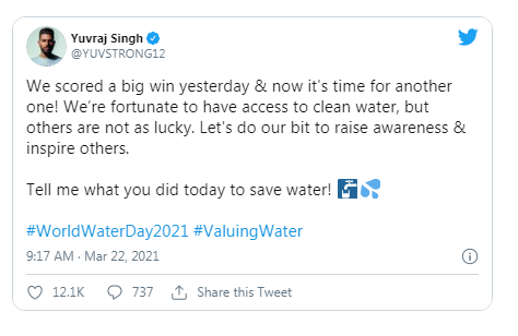 Yuvraj Singh is raising awareness about the importance of saving water. Soon after the India Legends win in the Road Safety World Series final against Sri Lanka, the former India all-rounder posted on his social media that not everybody is luck to have access to clean water and we should all do our bits to save water.